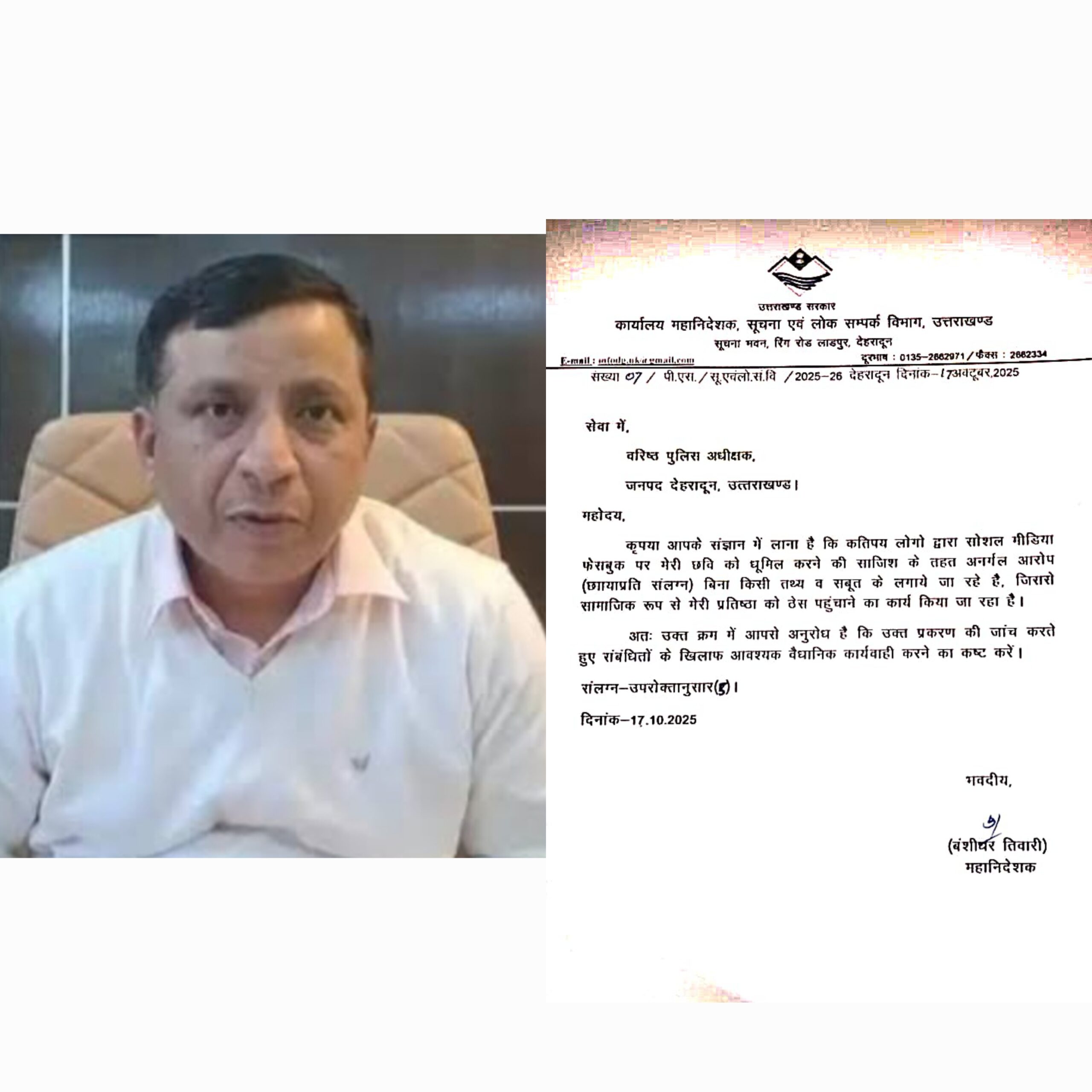 देहरादून, राज्य के सूचना महानिदेशक (DG Information) ने अब सोशल मीडिया पर उनके खिलाफ चल रहे भ्रामक और अनर्गल प्रचार को लेकर सख्त रुख अपनाया है। उन्होंने एसएसपी देहरादून को औपचारिक शिकायत दर्ज कराते हुए कहा है कि कुछ लोग सुनियोजित तरीके से उनकी छवि को धूमिल करने का प्रयास कर रहे हैं। शिकायत में उन्होंने इस साजिश के पुख्ता डिजिटल सबूत भी पुलिस को सौंपे हैं।