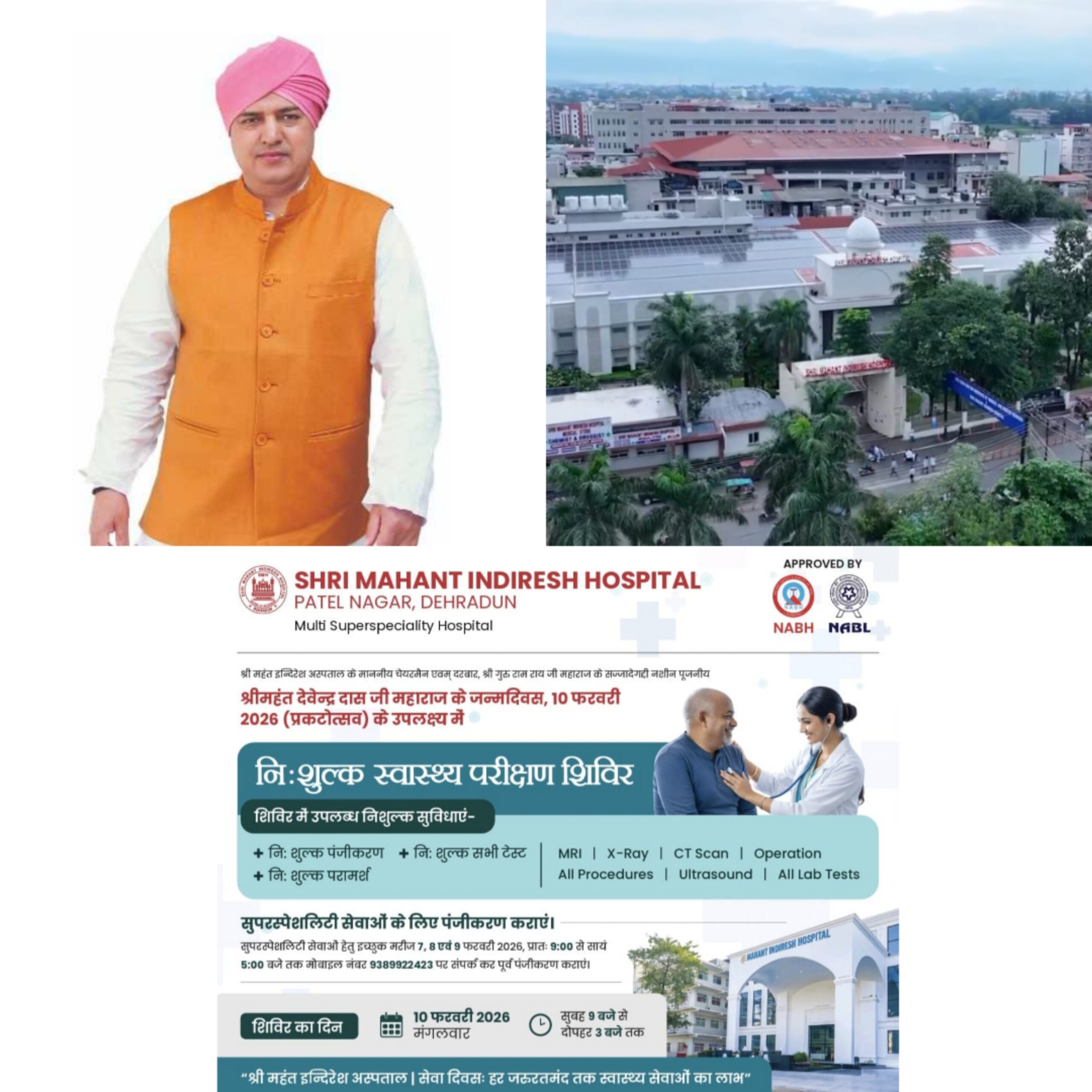 देहरादून। दरबार श्री गुरु राम राय जी महाराज के सज्जादे गद्दी नशीन एवं पूजनीय श्रीमहंत देवेन्द्र दास जी महाराज के जन्मदिवस (प्रकटोत्सव 10 फरवरी) के पावन अवसर पर श्री महंत इन्दिरेश अस्पताल, देहरादून द्वारा 10 फरवरी 2026 (मंगलवार) को एक विशाल निःशुल्क स्वास्थ्य परीक्षण शिविर का आयोजन किया जा रहा है, जिसे इस वर्ष सेवा दिवस के रूप में श्रद्धा, सेवा और समर्पण की भावना के साथ मनाया जाएगा। इस शिविर में जनरल चिकित्सा सेवाओं के साथ-साथ सभी सुपरस्पेशलिटी सेवाएं भी पूर्णतः निःशुल्क उपलब्ध कराई जाएंगी। शिविर के लिए पंजीकरण सुबह 08 बजे से प्रारंभ होगा, जबकि मरीज सुबह 09 बजे से दोपहर 03 बजे तक स्वास्थ्य सेवाओं का लाभ ले सकेंगे।